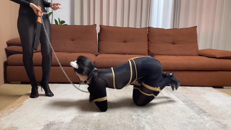 “哼,小毛贼,今天让你见识一下老娘的厉害。”之前被捆绑羞辱的柳洋迫不及待地展开报复行动,直接将恩可拖到地上侧卧着捆了个K9犬缚。