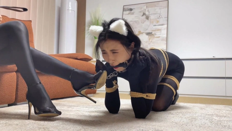 过了半晌,恩可醒了过来,惊恐的发现自己居然捆成了小狗模样,想要说话但嘴巴被骨头口枷塞住。柳洋慢慢走过来捏住恩可的脸:“好你个小毛贼,偷东西偷到我家里了,居然还敢趁我自缚的时候偷袭我,现在换我调教调教你了。”柳洋一面贴脸细嗅恩可一面用手不断在恩可身上游走,“你这身材也不错嘛”话毕柳洋双手狠狠地捏了两下恩可的玉足。“现在轮到你体会那种痛痒难耐欲罢不能的感受了。”边说话柳洋边拿起刺轮对着恩可的玉足进行猛攻。