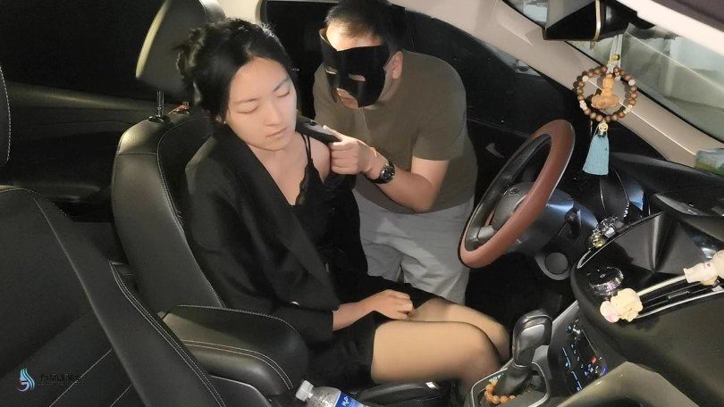 一家公司的女高管如同往常一样,下到公司所在写字楼的停车场,准备开车回家。她头发束成干练的发髻,戴着耳坠,挎着职业女性的皮包,穿着职业套装衣裙,内穿蕾丝吊带内衣,3D薄的黑色连裤丝袜,脚上穿着尖头高跟鞋。她步伐较快,解锁自己的车,并坐上了驾驶座,把包包放在副驾驶座上,关上了车门并上锁,系上了安全带,发动了车子。这时,一名双手戴着皮手套的蒙面神秘人突然从后座窜出,用喷了迷药的毛巾捂住了她的口鼻。她对这突如其来的袭击毫无防备,惊恐地瞪大双眼,稍迟了一两秒钟,开始了较为剧烈的挣扎,丝腿交替高抬,屏住呼吸,以免吸入毛巾上的迷药,发出非常强烈的“唔唔唔”的呼救声,一度按响了方向盘上的车喇叭求助,并将安全带拔出去扎后座的歹徒,但只是徒劳,尽管没有了安全带的束缚,她能更自由地做挣扎的动作。但由于剧烈挣扎耗尽了她的体力,她之前的屏住呼吸也无法坚持,反而导致其在补偿式呼吸时短时间内大量吸入毛巾上的迷药,此时能听见她沉重的呼吸声,“唔唔唔”的声音也逐渐低沉,频率逐渐降低。由于药物的作用,她逐渐虚弱无力,不屈的眼皮逐渐耷拉下来,睡了过去。此时,毛巾慢慢从她的口鼻上移开,她的嘴先是张开,憋住的气舒了出来,无声“啊”了一下,慢慢闭上,身体稍稍向内倾斜。然后,这名神秘人一边用手玩弄了她的睡脸和丝腿,先摘掉她的高跟鞋,再脱掉她的裙子,然后扒了她的外套,只剩下蕾丝吊带内衣和连裤丝袜,并摘下她的耳坠,解散了她那干练的发髻,期间多次抚摸她的脸和身体,并闻着她整个丝腿的香气,脱下来的衣物都整齐地叠放在了副驾驶座上。接着,神秘人用绳子和锁链把她绑在驾驶座上,用手铐把她的双手拷在方向盘上,用脚镣将她的丝脚踝铐住,并在她的汽车香薰里滴入了毒液,打开了汽车的空调内循环,在她车子的方向盘上插了一封信,把手铐钥匙放在手柄旁,然后坏笑着关上车门离开了。