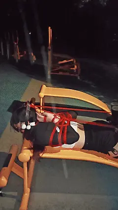 之后露露被带到天桥下,在长椅上继续折磨电击,随后便拿出包里的道具————野餐垫、眼罩和一捆绳子,露露现在要被海老缚放置在无人的公园草地!