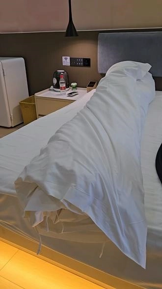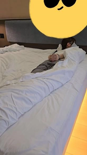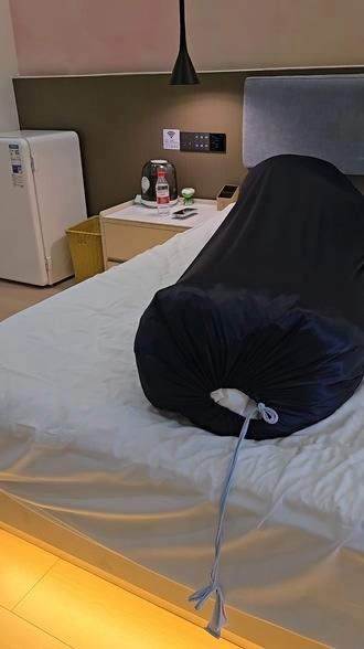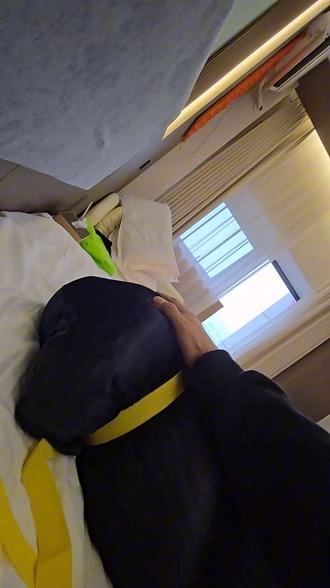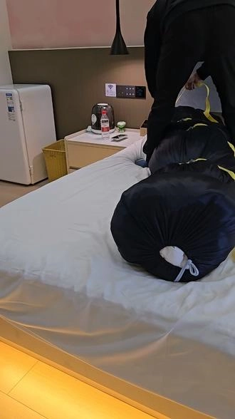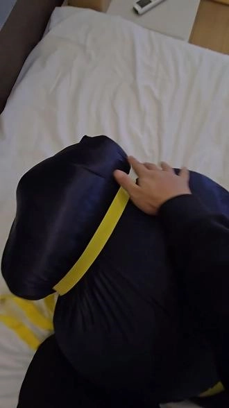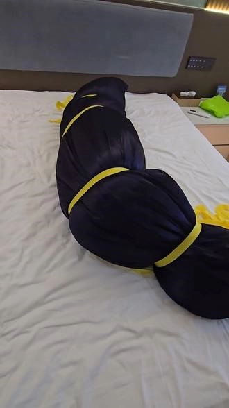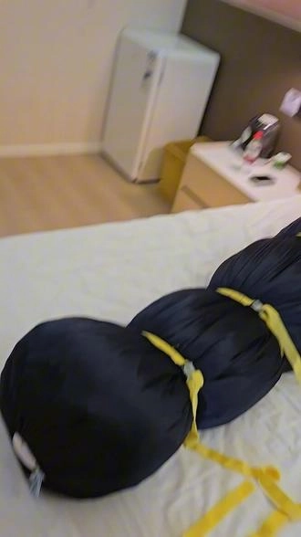 › 【小黑】戴上手铐,再用棉被全包,再装进丝袋,再用收紧带捆上,这次双手完全无法挣扎,头部勒得很紧,超难受。