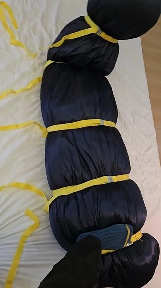 【小黑】戴上手铐,再用棉被全包,再装进丝袋,再用收紧带捆上,这次双手完全无法挣扎,头部勒得很紧,超难受。