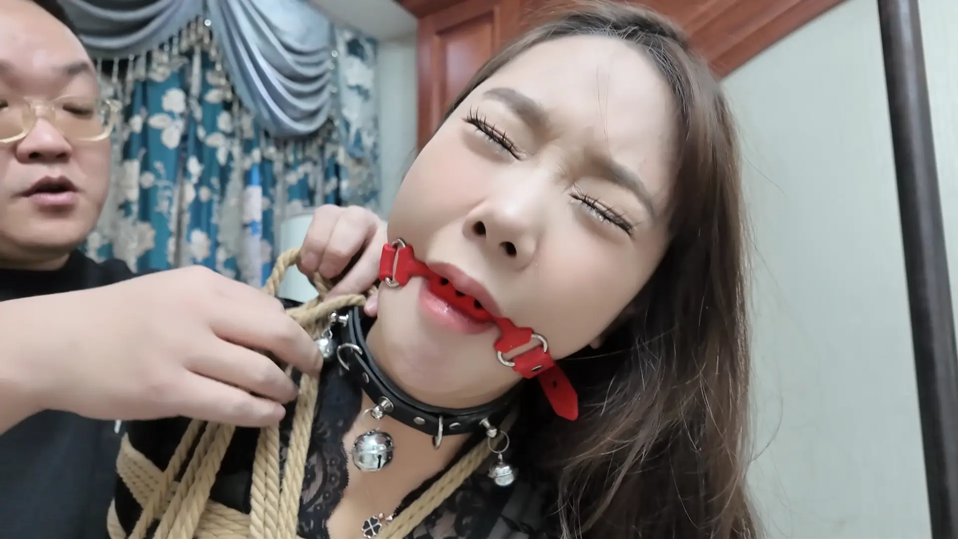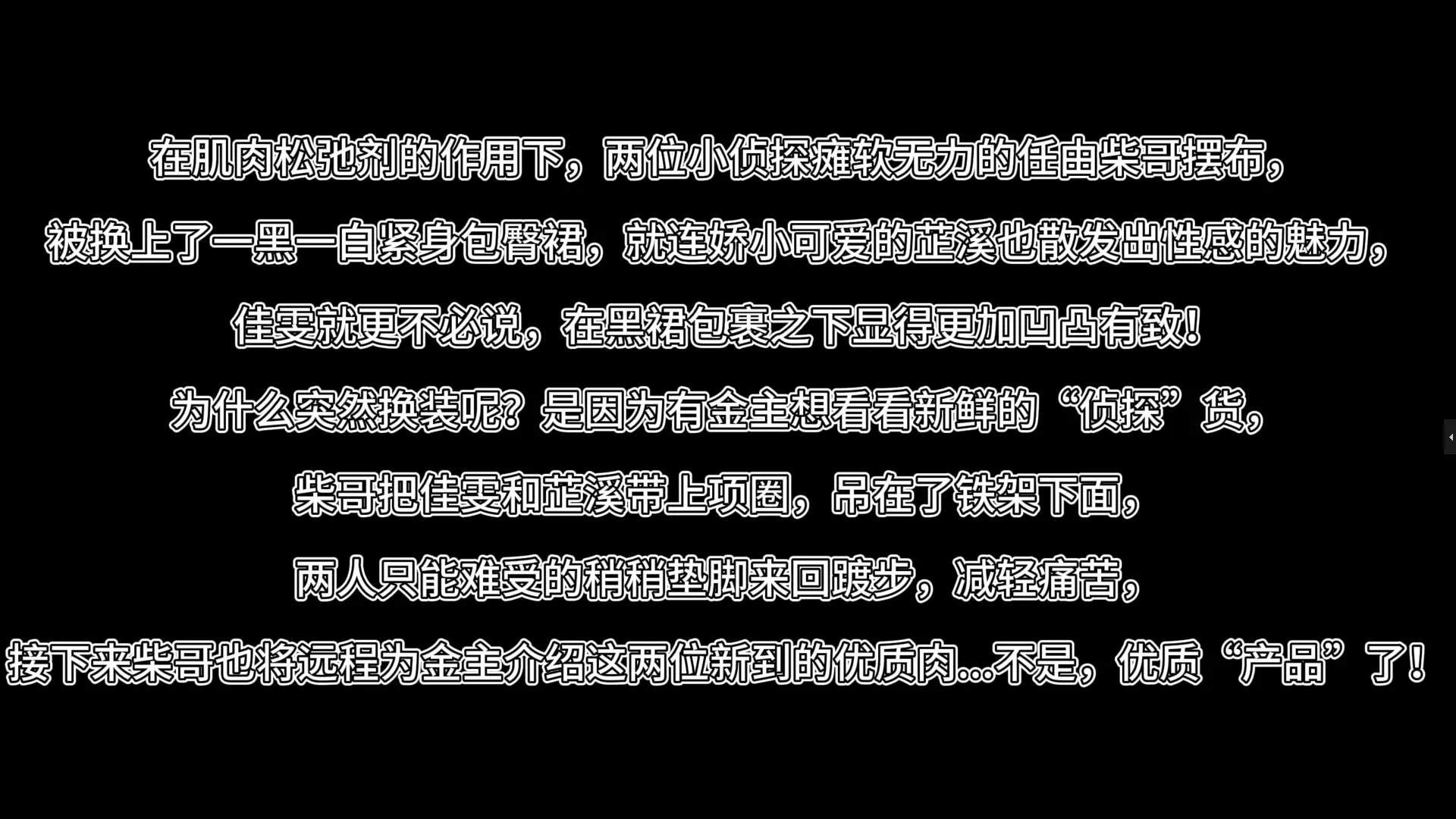 柴哥把佳雯和芷溪带上项圈,吊在了铁架下面,