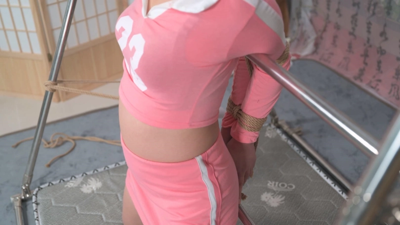 妹子穿个足球宝贝装,也算是应一下世界杯的景。本来设计的是跪缚然后把腿折起来缚,一时没找到绳子着力点,就把小腿分开来固定,这样就像立起来的公主坐,可妹子表示有点受不了,一开始不以为意,后来看她的表情着实是挺痛苦的,腿是被扭转的,于是她就开始她经典的不满意的小表情,而我也只能让她再多呆一会,以表敬意。