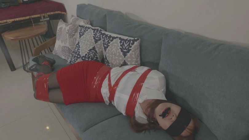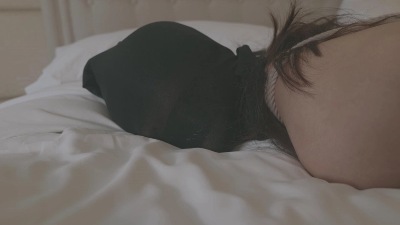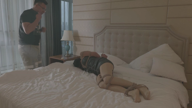 当翻到卧室的时候,被眼前的景象惊呆了,床上一个被捆得性感的不得了的,头上套着丝袜的尤物正在发出呜