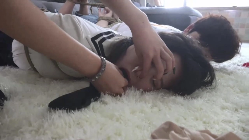 黑衣女匪把阿妙男友脚上穿的臭烘烘的一双黑色锦纶丝袜塞入阿妙口中,把阿妙脚上穿的一双白色锦纶丝袜塞入阿妙男友口中,再分别用两条肉色连裤丝袜勒住情侣二人的嘴巴。