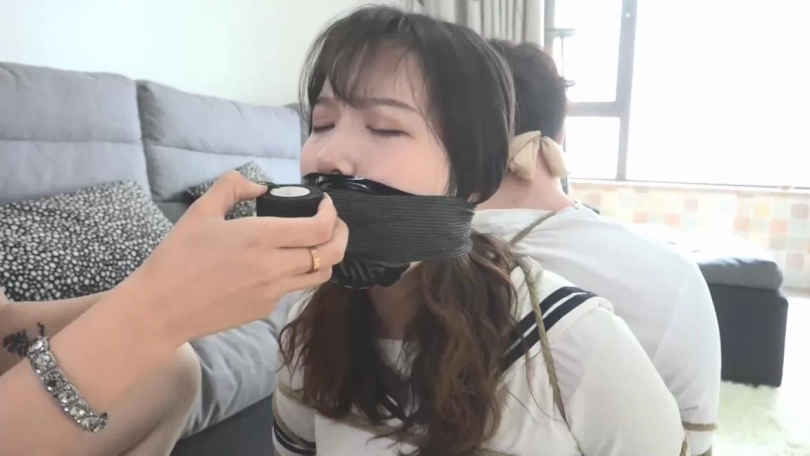 黑衣女匪从包里找出一条白色内裤,拽出阿妙口中黑色锦纶丝袜,对阿妙说:这是我穿过的内裤,你看你手绑着,那我只好塞到你嘴里了。于是这条白色内裤被塞入了阿妙的口中。她只能痛苦呜呜闷哼着。黑衣女匪用黑色电工胶布剪下5张,封在阿妙嘴外,再用黑色静电胶带沿她脑后缠绕5圈,再拿黑色自粘绷带缠绕5圈。