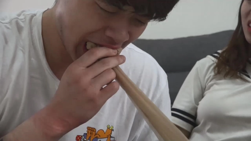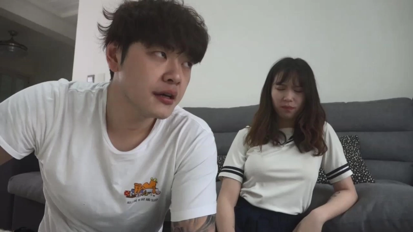 阿妙与男友互相对视呜呜闷哼抱怨着。