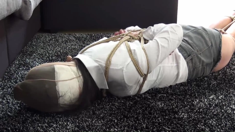 笑笑在地上奋力挣扎,最终挣脱束缚,一点点解除套头物与封嘴束缚,拽出口中已经湿润的棉袜与短丝袜,大口喘息着。