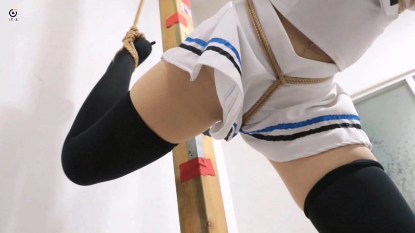 菲儿穿着一身紧身JK水手服来工作室应聘模特,换上了X感的丝袜靴(有换鞋的特写),被绳师单腿吊起来测试柔韧性和耐力,还给嘴巴小的菲儿戴上了一个超大的口球,菲儿被吊的很难受却发不出声音,口水都流成了一条线。