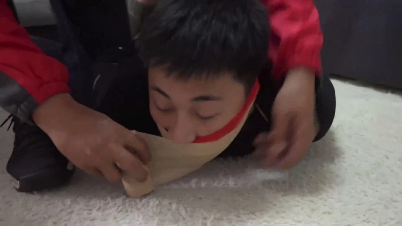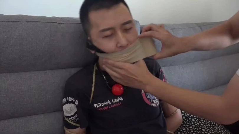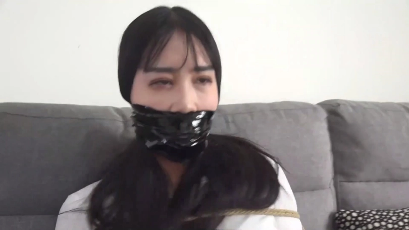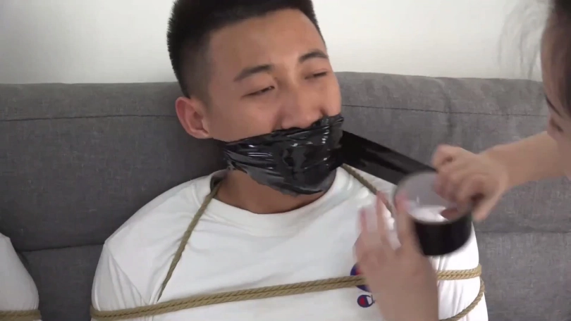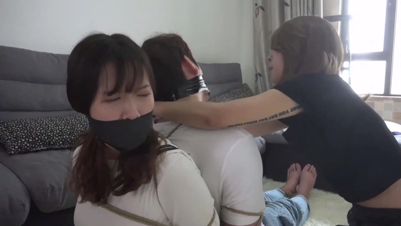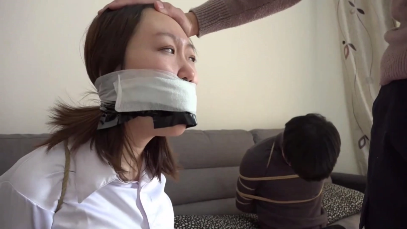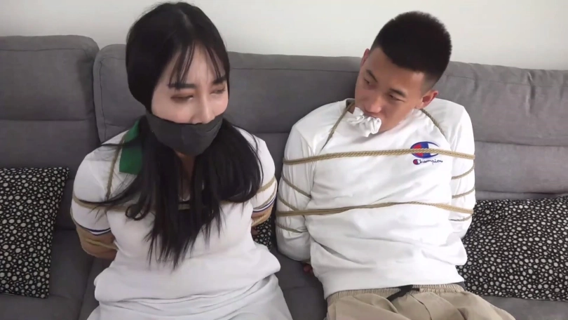 片段2:美女文冰下班回家被入室歹徒捂嘴劫持,被迫脱掉穿的原味肉色连裤丝袜塞男朋友嘴里,被捆绑后歹徒很恶趣味用文冰男友脚上穿的原味黑色棉袜塞她嘴里,再用黑胶布封嘴,情侣二人互相抱怨试着解绳子反被歹徒发现,不仅捆成驷马还被用红色胶带与肉色自粘绷带来回缠绕多圈封嘴。(PS:有一段没有声音,工作室做后期时没做好)