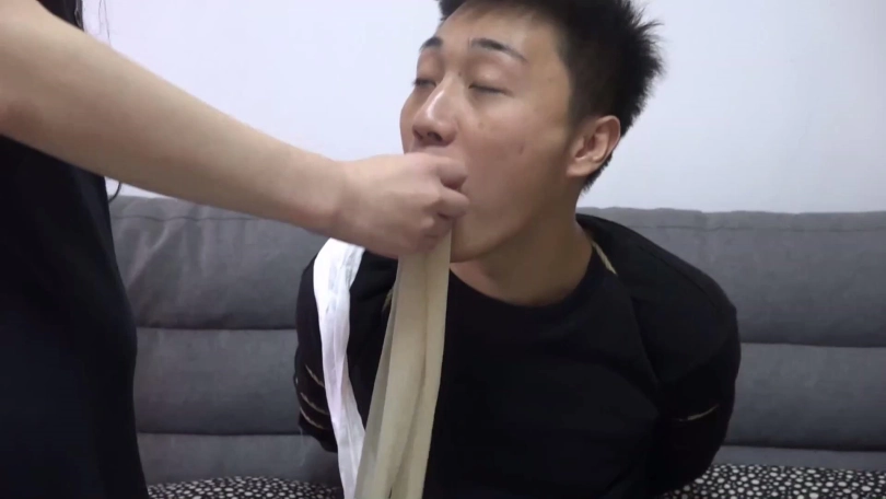 片段4:美女阿桃与男友得罪孙甜,被孙甜捆绑折磨,孙甜为了报复这对小情侣,用自己穿过没洗的一条黑色连裤丝袜塞阿桃嘴里,再脱掉阿桃脚上穿的一双白色棉袜塞到阿桃男友嘴里,给二人用黑胶布与黑色自粘绷带缠绕封嘴,封堵得严严实实。