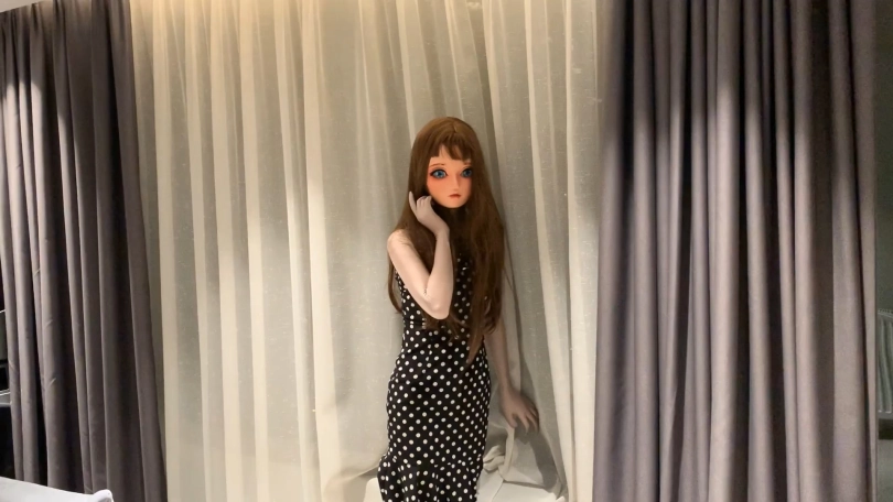 用扎带先把紧身衣的拉链锁起来,然后戴上头壳之后穿上高跟鞋和波点裙,做一晚上的乖娃娃