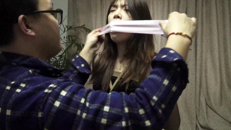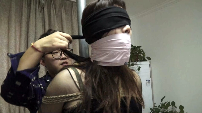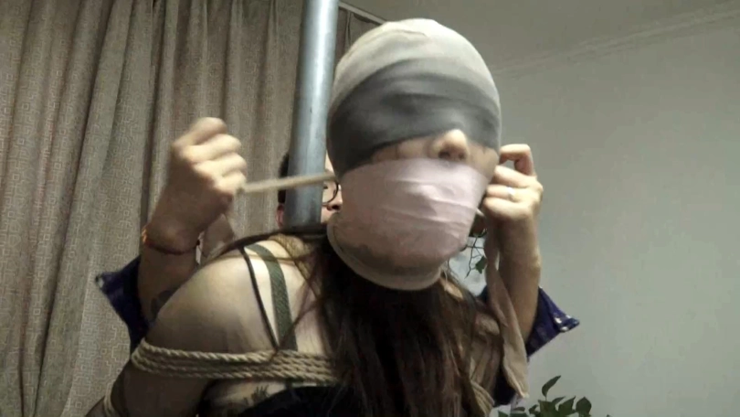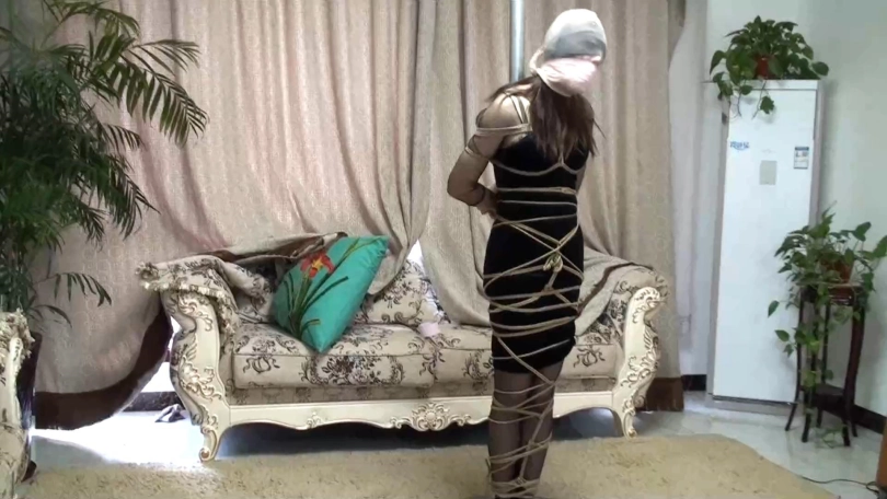 高个子的模特身穿一身黑裙与黑色丝袜,[X_X]地站在柱子前被绑好,从头到脚连脚趾与手指都被绳子绑了起来。嘴巴被胶带封嘴,布条蒙眼,再用丝袜套住头。呼吸困难的模特就这样被绑在了柱子上。