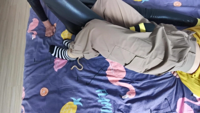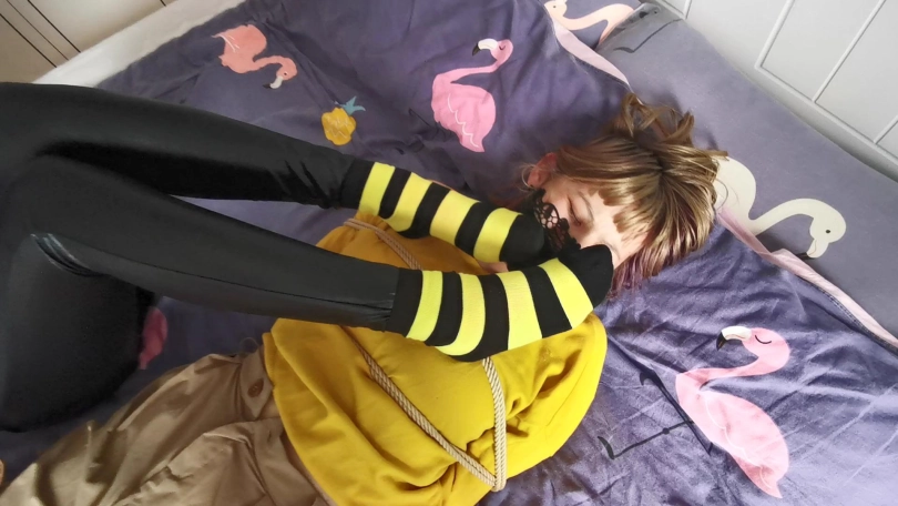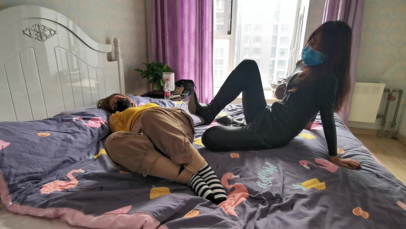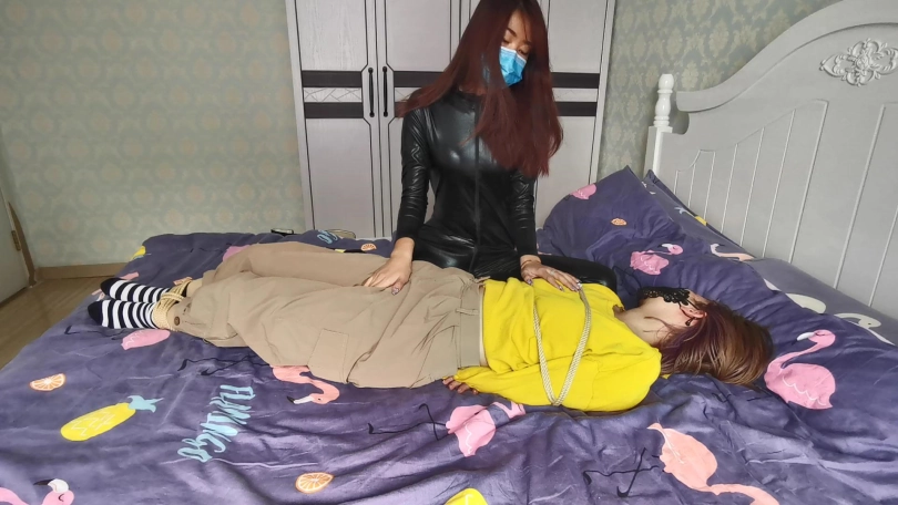女贼入侵一间房屋,将熟睡中的女孩捆绑起来,并逼问钱财。但女孩并不想乖乖就范,女贼只能自己动手寻找。女孩则趁机解开了脚上的束缚,女贼这时进屋发现了并重新将女孩捆绑。没有找到财物的女贼气急败坏,用自己皮靴的高跟狠狠的踹着女孩,让女孩交出钱财。但似乎女孩把钱财看的比自己还重要,坚决不说。女贼只能用上杀手锏,脱去自己的靴子,将自己走了一天的棉袜脚捂在了女孩的脸上。女孩被着强烈的味道熏的受不了,不断的躲闪。女贼的脚不断的在女孩身上游走,刺激女孩的胸部和下面,不断的挑逗着。女孩强忍着下面传来的刺激感,不断呻吟,但就是不从。女贼玩累了便去了客厅沙发上休息,而女孩也利用这机会挣脱了束缚。。。