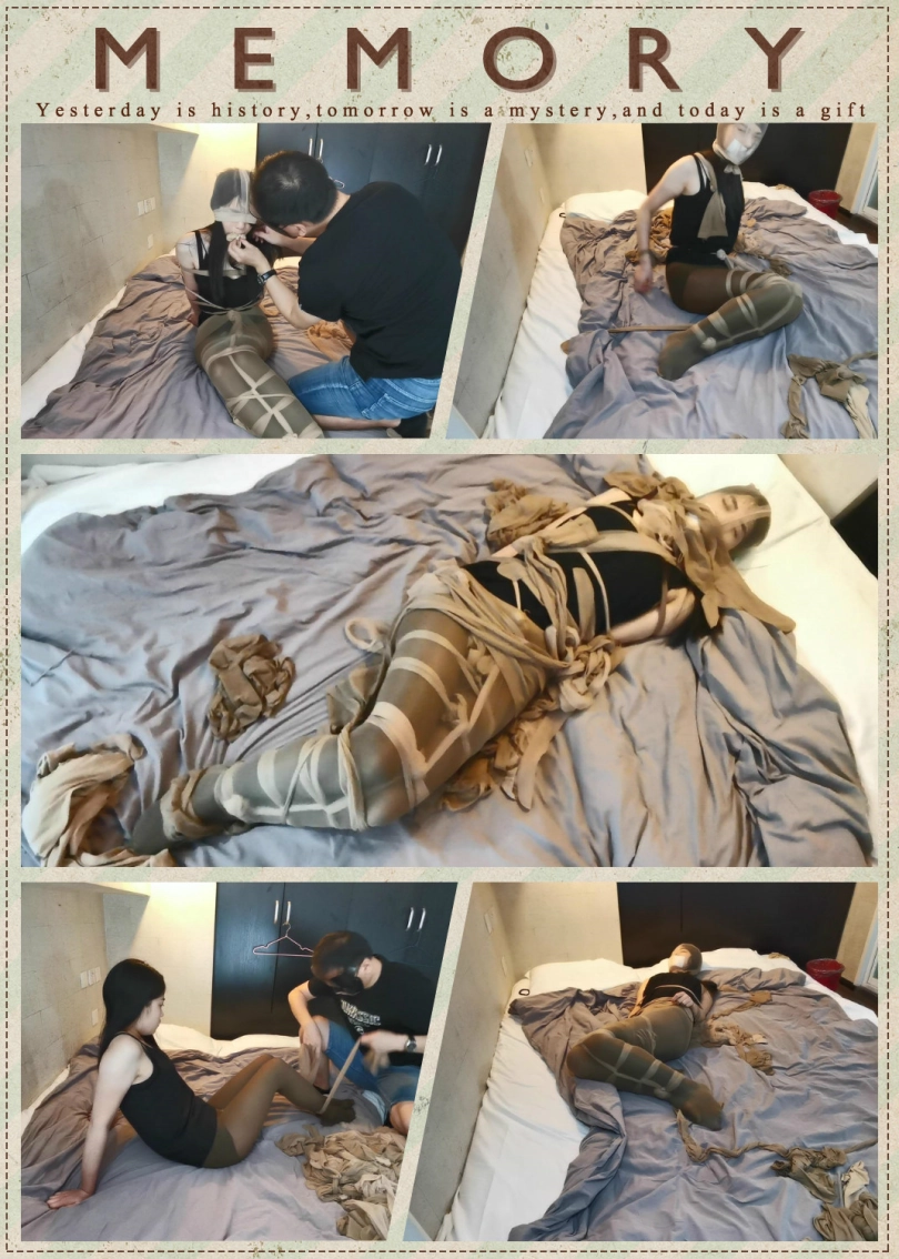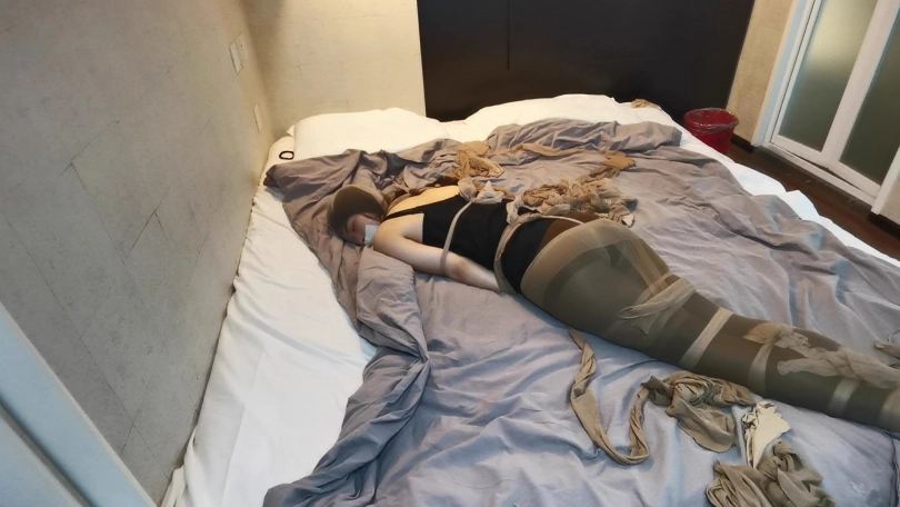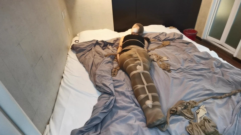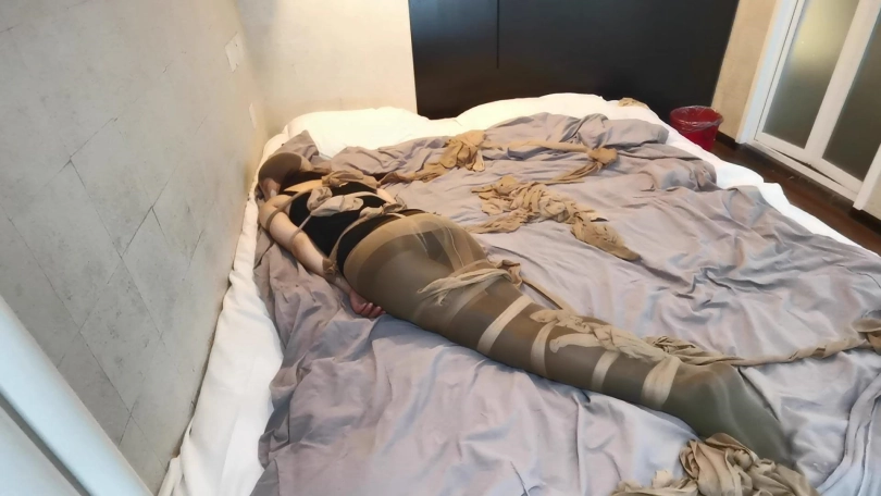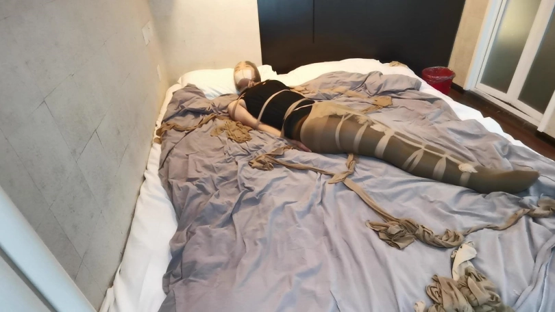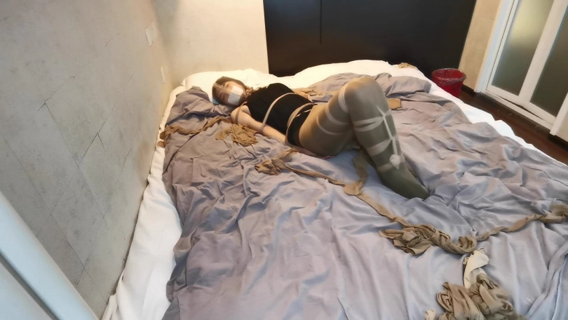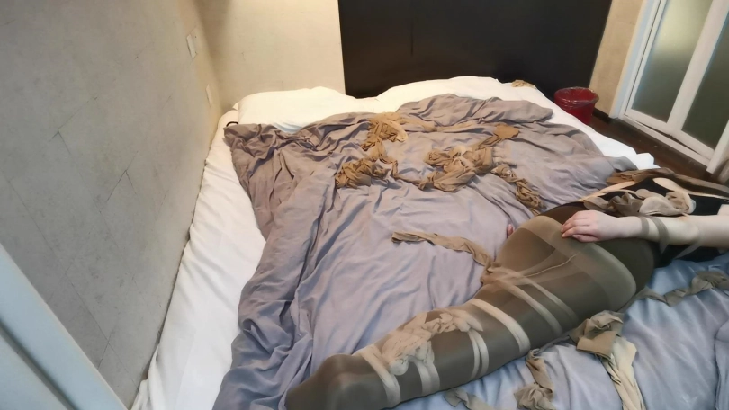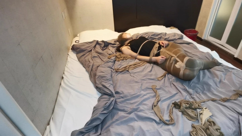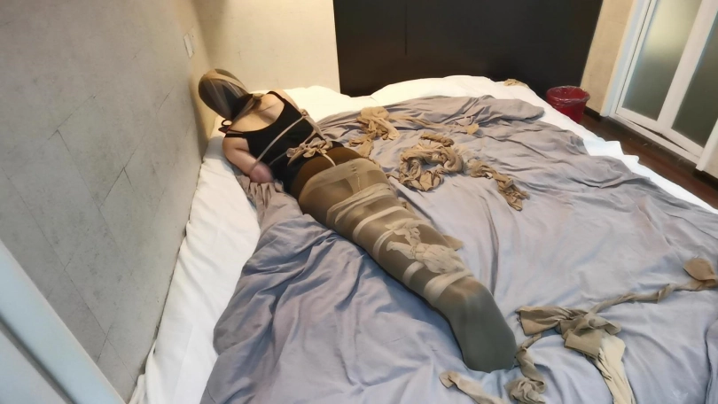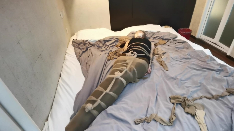 将小冷全身用丝袜捆绑起来,嘴里塞进丝袜,外面用胶布封住,再用丝袜套头。床上扔了很多丝袜,让小冷与丝袜共眠。(这次手部并没有放到身后捆,而是在绑在了腰部两侧。因为担心我会睡的很沉,万一出现意外情况,小冷嘴塞着丝袜叫不出来,可以挣脱手上的束缚自救。但腿上丝袜捆绑的还是比较紧的。这么长的时间没有丝毫松动。)