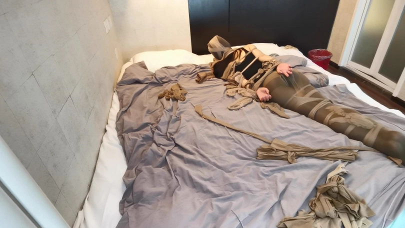 本次拍摄是比较痛苦的,这次叫了3名模特,定制的单子比较多,时间也比较紧张。两天睡了不到6小时。早上勉强拍了小冷两个片,中午吃饭后,本人实在是扛不住了,困意袭来。突然想到可以拍一个长时间束缚放置的视频,自己也可以休息下。于是就有了本部作品。