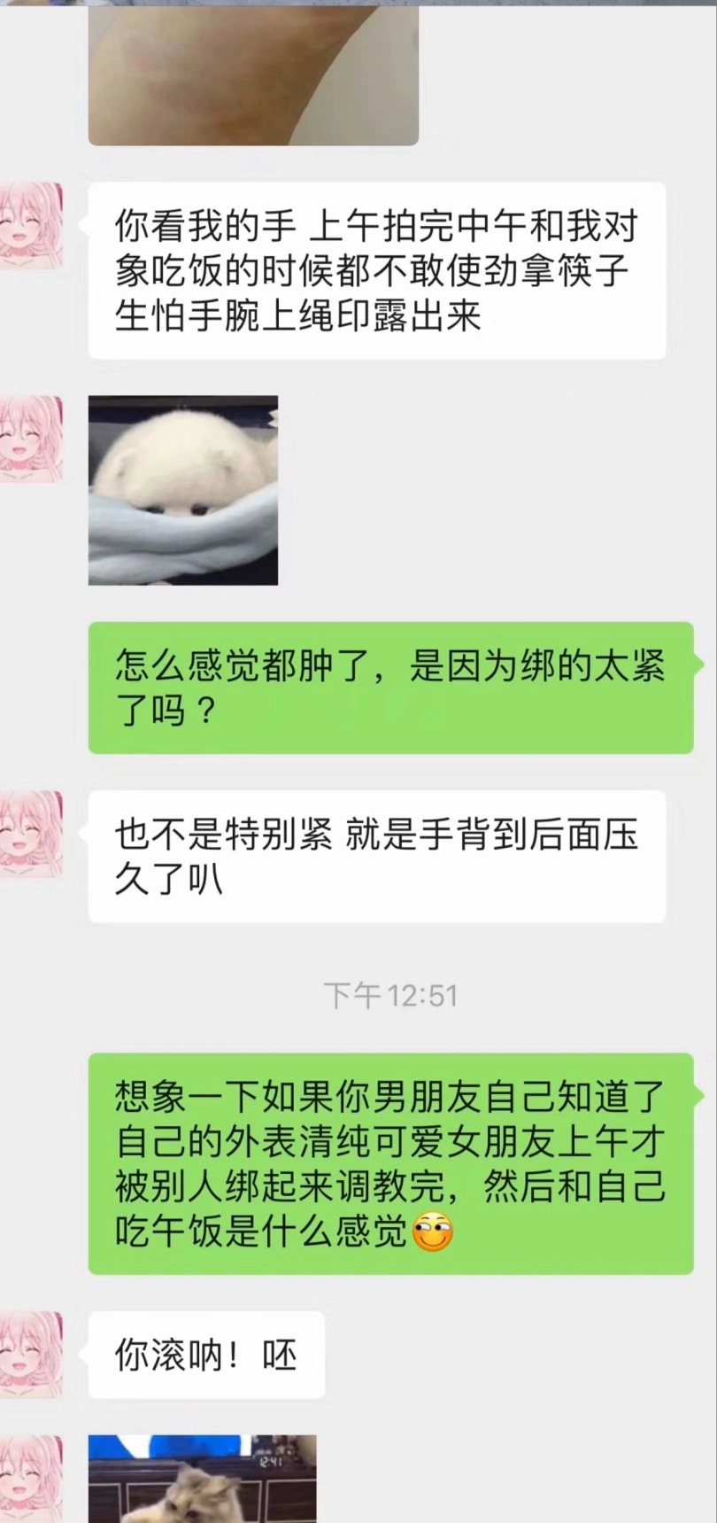 教练我想学打篮球,篮球可没那么好学,学篮球首先要被戴着项圈捆绑调教,女学员 :??? 我靠。 咳!首先龟甲缚加上绳裤嘞下面是要锻炼身体的耐力,鞭子抽打是为了锻炼身体的抵抗力,td和棒棒是为了激发身体的活力,把脚吊起来是为了锻炼腿部的肌肉跳的更好,tk挠脚是为了打球时跑得更快,女学员:原来如此 说的很有道理!咳 这么一本正经的胡说八道我自己都信了,捆到最后手的紫了 ,菲妹与摄影哥哥的聊天记录,没关系菲妹中午就去和男朋友吃饭去了,但是不敢让男朋友看到手上的绳痕,想象一下如果男朋友自己知道了自己的外表清纯可爱女朋友上午才被别人绑起来玩完,然后和自己吃午饭是什么感觉?