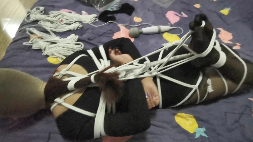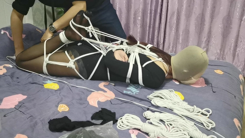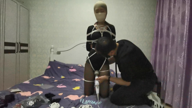 瑾萱穿着黑色丝袜和练功夫还是很有型的。用百米长的绳子将她全身紧紧的捆绑成驷马,脚趾也不放过。嘴里塞着丝袜,医用胶布封嘴防止她吐出来。在给她戴上口超限制呼吸。丝袜套住她的头,白色的口罩在丝袜头套里若隐若现很有感觉。[不可描述]棒刺激着她的下面,没过多久瑾萱就受不了求饶了。