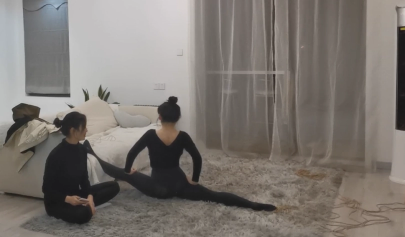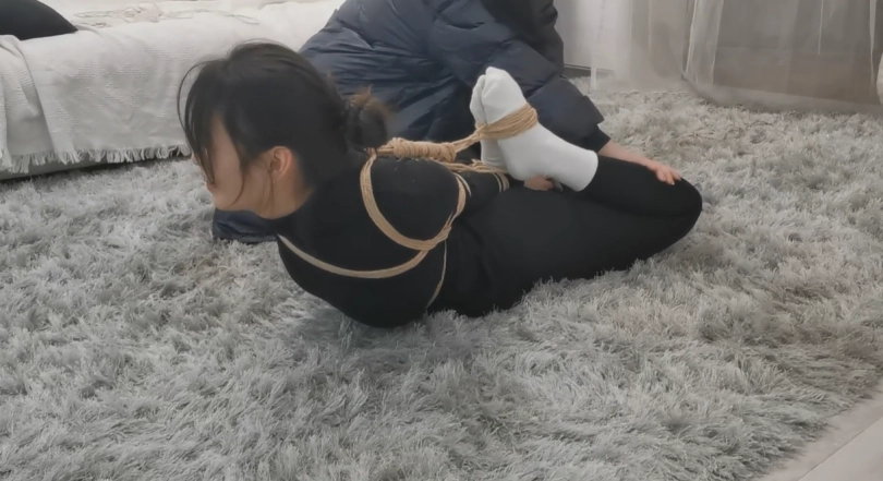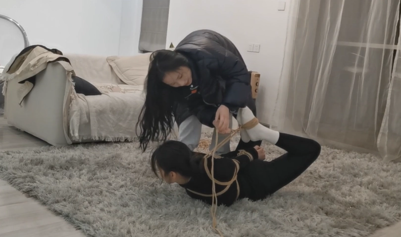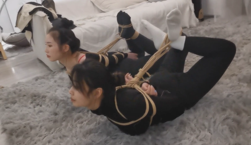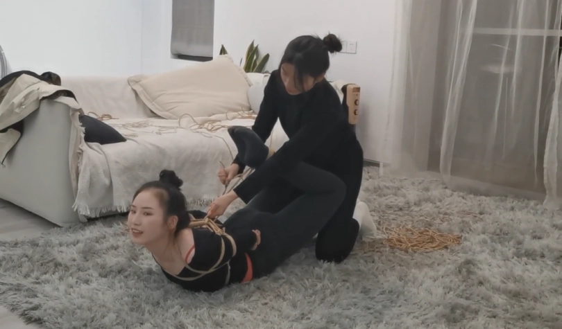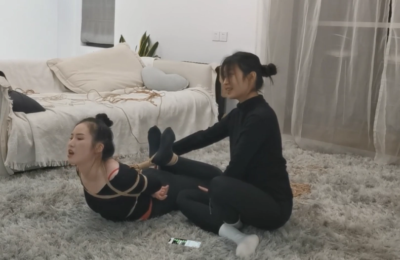 Kwen带来的新姐妹,一起学民族舞的。拍摄过程中,本来是想去扶一下相机,让Kwen帮忙拉一下绳子。谁知道Kwen直接下死手,把连接姐妹手和脚之间的绳子拉倒只有一指宽....,Kwen被绑时直接迎来闺蜜的疯狂报复..