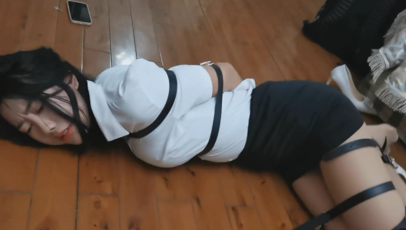第二幕:小丁艰难的打量着自己。发现的双手双脚,分别被皮制的带子紧紧捆绑着。每一道捆绑带上,还被上着锁。与此同时,一根皮带穿过脚腕和手腕中间,把自己的身体绑成反弓状。这下,小丁活动的余地更小了。(画外音:到底是那个变态在玩这种捆绑游戏呀,绑松一点行吗,这个皮带,比绳子还难解开,皮带全部勒紧我的肉里面了,一阵阵的疼,幸好穿了丝袜,不然腿上勒出伤痕,明天都不知道出去见人)。见此状,小丁下意识想喊救命。发现自己嘴巴里含了一个球一样子的东西。(画外音:我嘴里是被绑了一个球吗?把我的嘴撑的好大,天啊…口水都咽不下去,快流出来了,好羞耻…。)这个时候,口水开始慢慢的从小丁口中不断的流了出来。