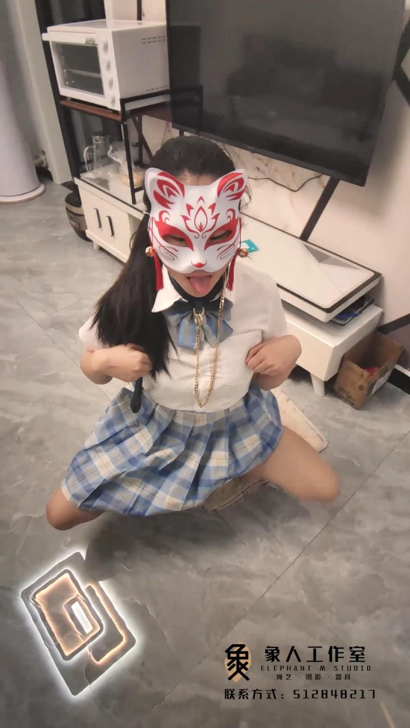 主人给小鹿拴上牵引绳,小鹿自觉的咬着尾巴放到主人手里,主人给小鹿戴上尾巴。脚踩在小鹿的头上,用藤条把玩下小鹿的尾巴。