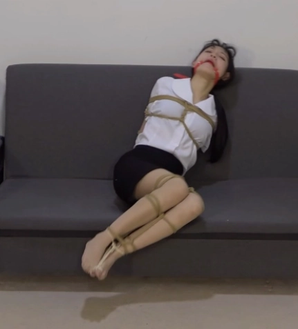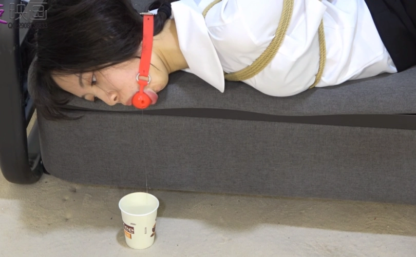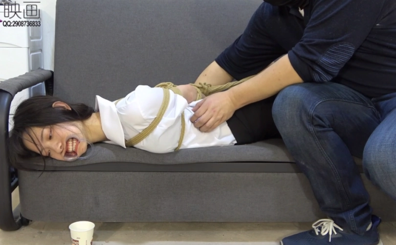 玩腻了的罪犯重新换了一种玩法,这一次他用不同的道具来堵住小A的嘴,接着再将她捆成驷马,在她旁边放了杯子。