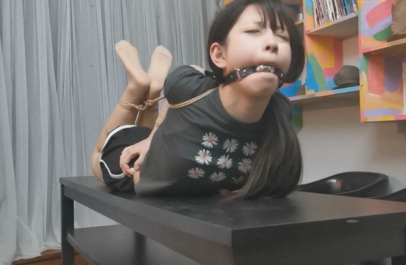 第二幕: 珊珊被支臂驷马捆绑在桌子上。双腿也被捆紧。一根皮带穿过珊珊的脚踝和手腕,使珊珊身体反弓绑成了驷马状态。嘴里被塞上了口球。口水顺着嘴角流了下来,珊珊收起眉头..由于绑的太紧,只能轻微的扭动的身子,害怕口水弄脏自己的头发,不断的摇着脑袋。