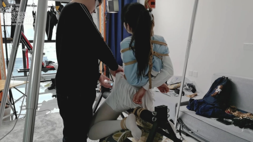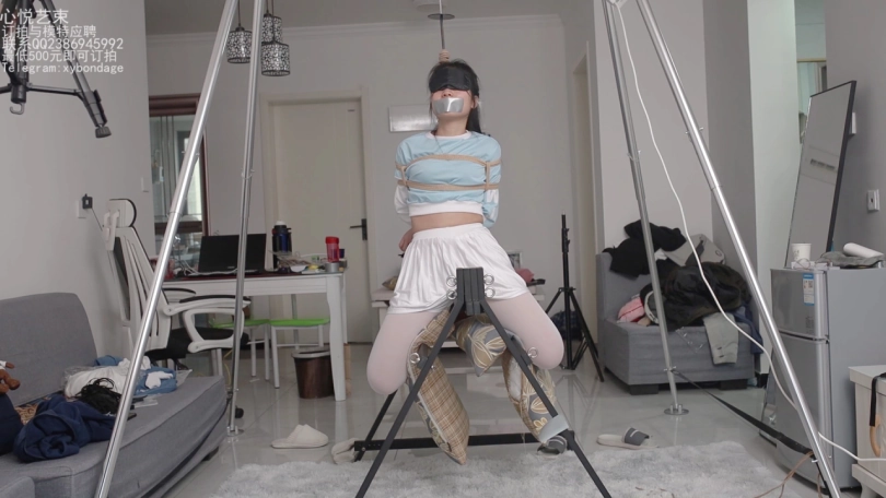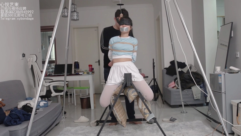 之前就想过这样试一下的,看了很多欧美的视频都有这种捆绑放置,但是第一此买回这个架子的时候发现这种方式真的好难好难的,妹子重量压在隐私部位,根本不可能全部撑住。这一次想了很多办法,用吊缚加垫子总算是把欣然放上去了,因为捆绑用时很久,这次就没有放入捆绑过程。只有两个机位拍摄的内容。包含tk挣扎,轻微鞭打和棒棒强制。