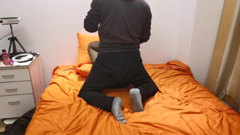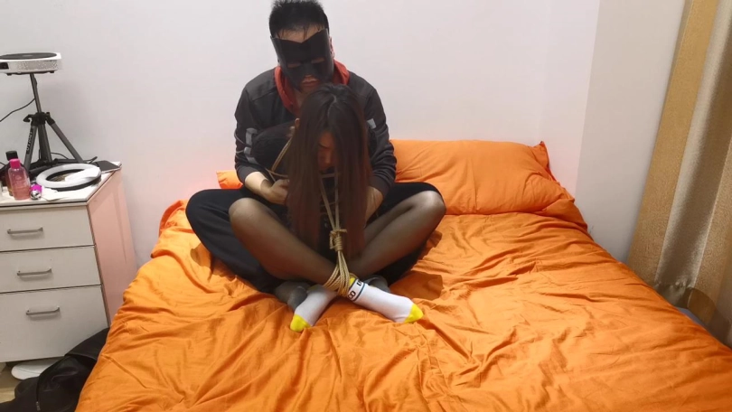 脱掉她的靴子,瑾萱腿上穿着黑丝,外面还套着一双黄白相间的棉袜。这次选择了一个比较难受的姿势,团缚。绑好后瑾萱根本动不了。脱下她一只袜子放在她的鼻子上,并给她戴上口罩,这样能让她一直闻自己袜子的味道。下面的敏感地方也被放上了棒棒刺激着,这让她既痛苦又煎熬。。。