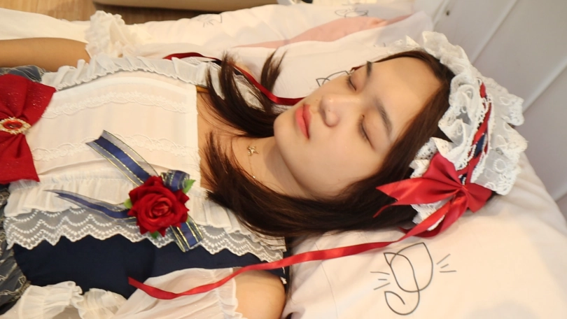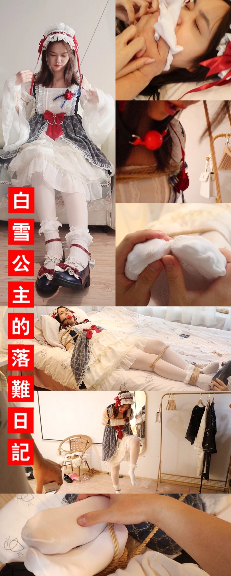 lolita公主裙 萧玥出演 ,白雪公主在睡眠被坏人用麻药捂住嘴巴,虽然惊恐地尽力挣扎但还是被迷晕了。在迷晕期间被坏人带上了口球,