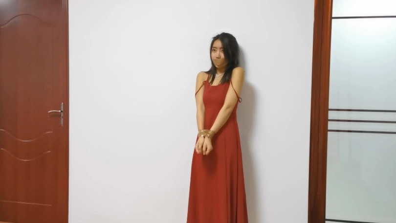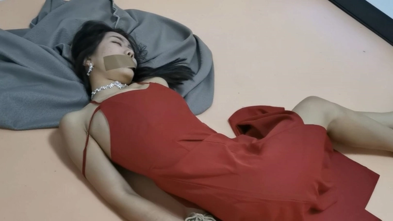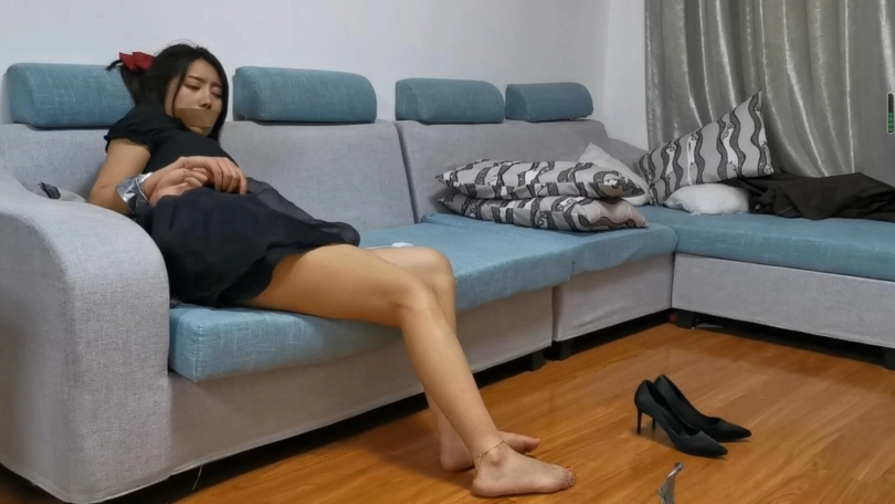 清纯性感美女小丁身穿连衣裙搭配着高跟鞋十分漂亮,正在房间沙发休息时被入室捆绑,胶带捆绑和封嘴,整个剧情用了两套服装,小丁挣扎也很给力