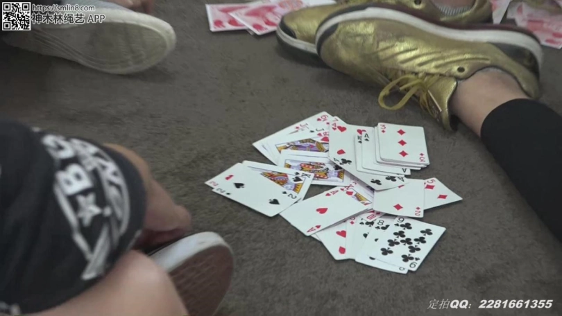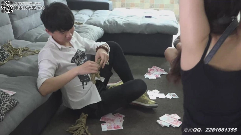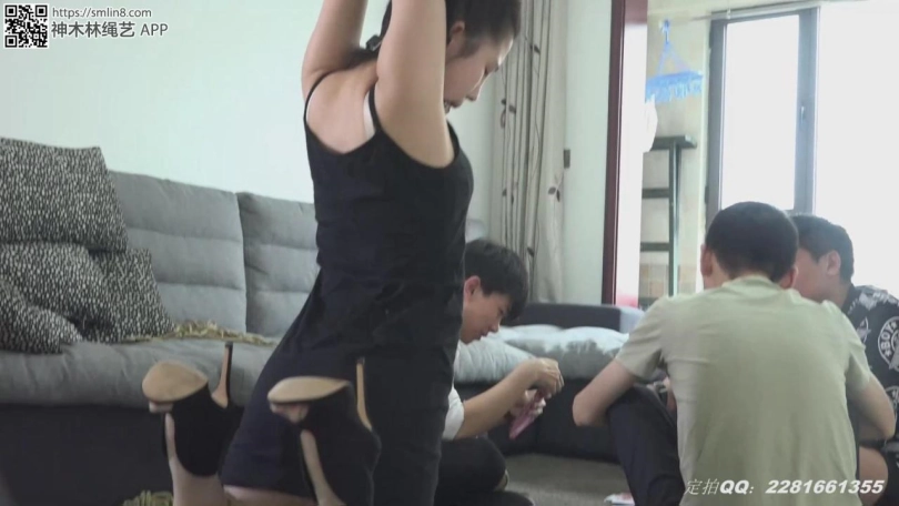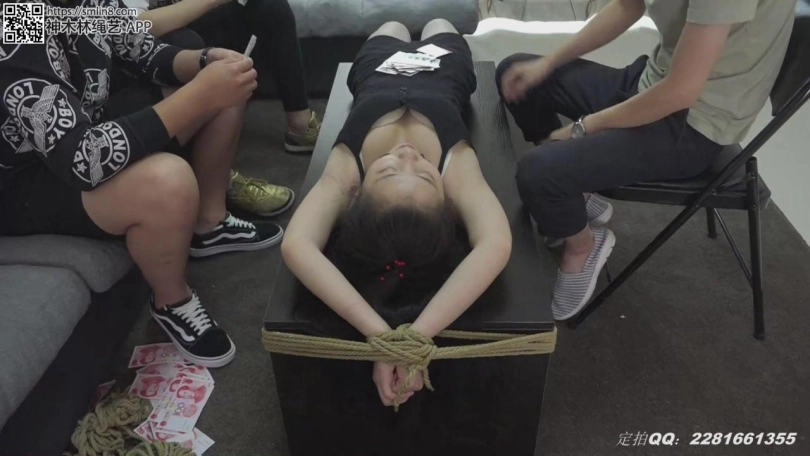 接下来是马老板捆绑甜甜,他把甜甜捆得跪在地上双手吊了起来,然后三个人继续玩牌。最后三个人想到了一个更好玩的办法:把甜甜绑在了茶几上,然后三个人就在甜甜的身上玩起了牌。。。。三个老板玩的很开心,约好了下次再来玩。甜甜拿着刚赚到手的钞票,不知道是喜还是忧。。。。
