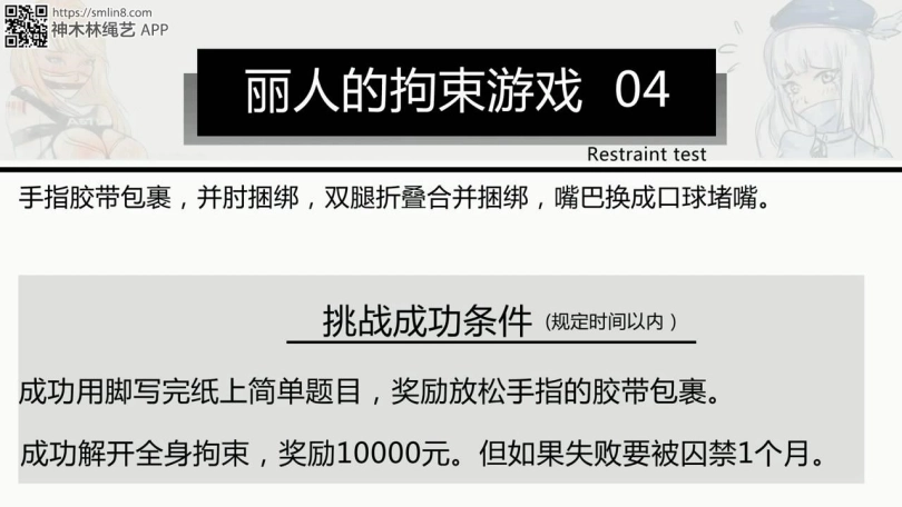 很明显灵感来自日本的紧缚实验,这个系列一开始非常有趣,但是长期的解缚太过单调,于是自己有了灵感,如果让美女被用奇特的方法捆绑,然后来完成各种游戏是不是会更有趣,于是带着这种想法制作出了中国版的紧缚试验,但内核做了改变,如果喜欢的请支持一下~如果喜欢这种玩法的也可以留言!