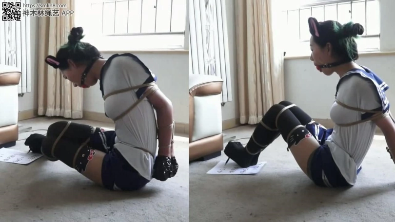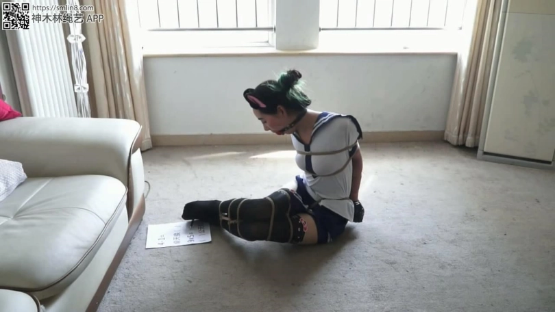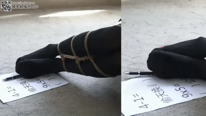 手指被松动的美女终于可以开始解缚了,但之前写试卷浪费太多时间了,美女费力挣扎,才把黑丝美腿上是绳子挣扎开。