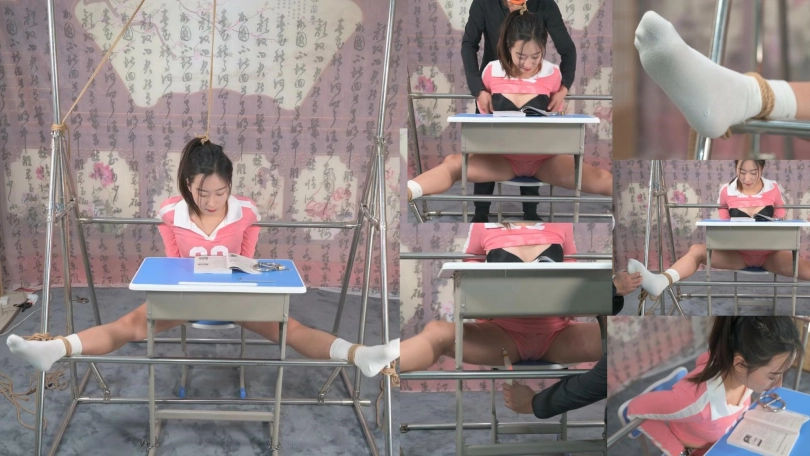 为了督促萱萱最近的学习,特设计这个针对自律能力差的强制学习桌,把她胳膊从钢管绕过后把双手铐在身前便于翻书学习,头发吊在上面,以正身姿。督导会不时采用TK挠痒的方式来干扰,以增强其抗干扰能力。当她犯困的时候,督导还会用电击的方法来给她提提精神,再犯困将有更猛烈电击。
