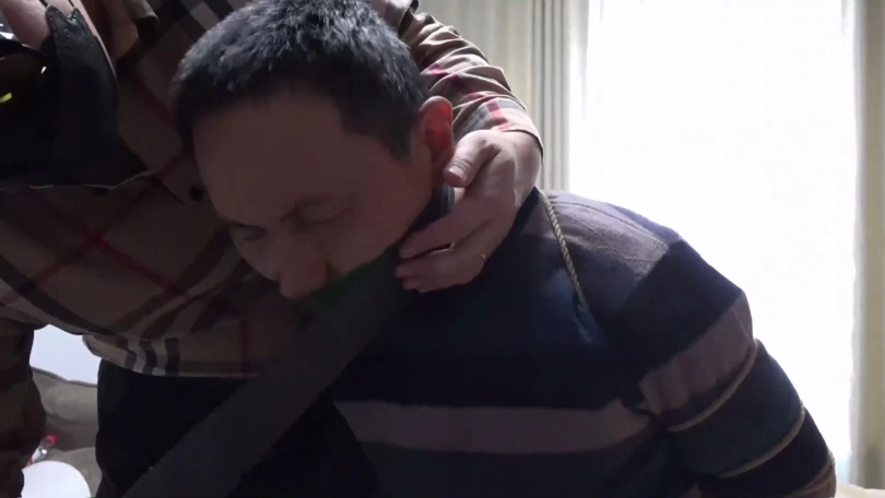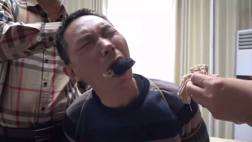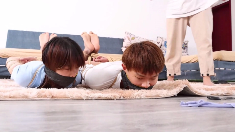 片段4:帅哥康行与女友小琛被歹人入室劫持后先用原味内裤塞嘴,二人互相解绳子被发现,歹人生气将他们捆成驷马并脱掉二人脚上穿的原味锦纶丝袜交换塞入情侣二人口中,并用胶布绷带一圈圈将他们嘴封严实。