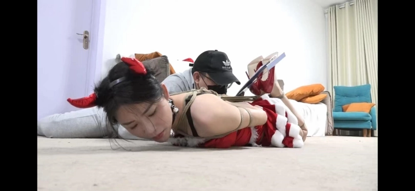 眼镜男子将柳洋上半身后手缚捆好,柳洋坐在沙发上说:“都玩这么久了,快把我放开,你该学习了吧。”眼镜男子说:“嗯,对也差不多了,可不能辜负老师的一片苦心,不过老师你要是趁我学习的时候跑了怎么办。”柳洋:“我就是来帮你补习的,我能跑哪去啊。”眼镜男子:“那不行,等学习完了在帮你解开,不过麻烦老师帮我把学习资料拿过来怎么样。”柳洋:“我被捆得动都动不了了,怎么去帮你啊。”眼镜男子扶着柳洋站了起来,拍了拍她的臀部说:“快去,不然我就不学习了。”柳洋没办法,只好一蹦一跳的跳到不远处将一支笔一个书本拿了过来。眼镜男子扶着柳洋让她躺在地上,拿出一根绳子准备将柳洋驷马捆绑起来。柳洋说:“你干什么。我都说了不会走的,还不把我放开。”眼镜男子:“那刚刚你为什么趁我出去还跑到客厅来了。”柳洋:“我那是有事,我不会跑的。”眼镜男子没有管柳洋的挣扎,于是将柳洋驷马捆绑起来。接着眼镜男子将书本放在柳洋背上,眼镜男子也是趴了下来,将柳洋当做了桌子,就趴在柳洋背上学习了起来。没一会后眼镜男子说:“老师你草稿纸忘记帮我拿了哦,我又不想自己去拿。”想了好一会说:“诶有了。”柳洋不知道他又出了什么鬼点子,只是突然觉得脚心传来了瘙痒的感觉,原来眼镜男子将柳洋的脚心当做了草稿纸,正在柳洋的脚心上写写画画。