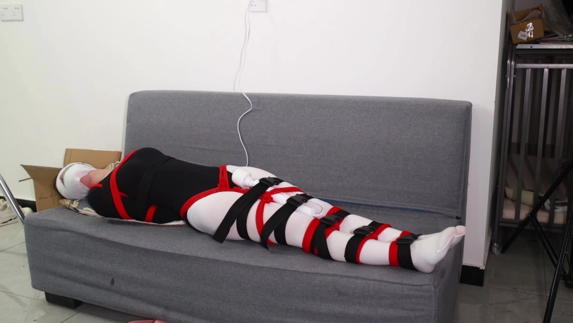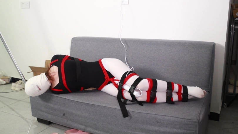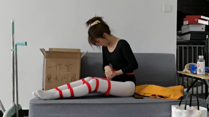 文文不放弃挣脱捆绑,但又过了一会,她的大腿和膝盖上半也绑了棉绳,她的双腿无论怎样挣扎也再分不开。