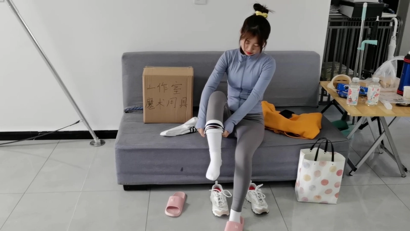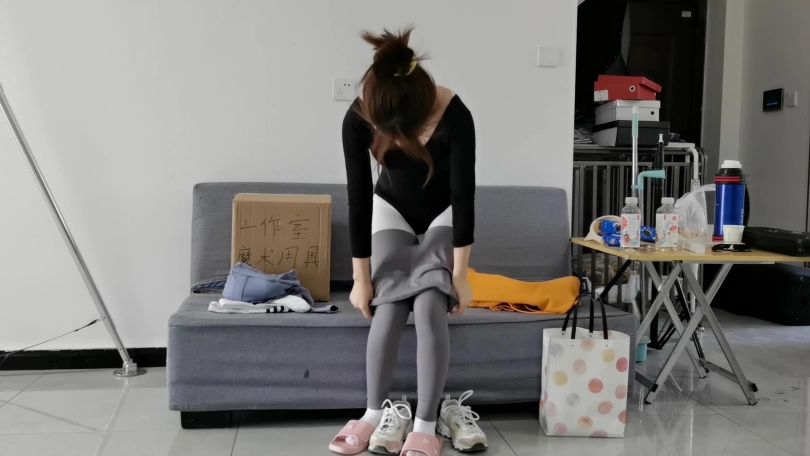 她坐下后先脱去鞋子,然后长袜、瑜珈裤和卫衣。脱去这些后,她的身上只剩下今天练习的长袖黑色练功服和白色的厚裤袜,然后穿上拖鞋后把脱下的衣服放回房间。