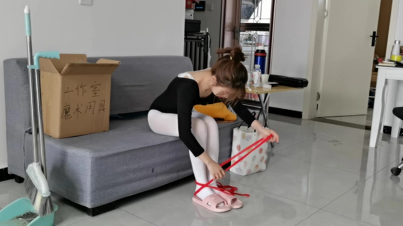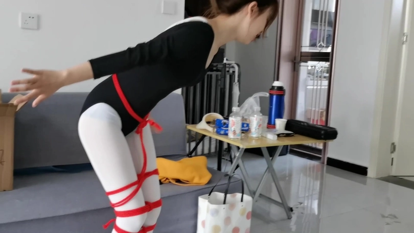 还是穿着拖鞋的她用力的站起来尝试跳到桌子上拿剪刀。当她跳到一半时,一条棉绳已在她的腰间出现,跟穿过她的胯部紧紧的勒着,股绳之间更有几粒绳结。