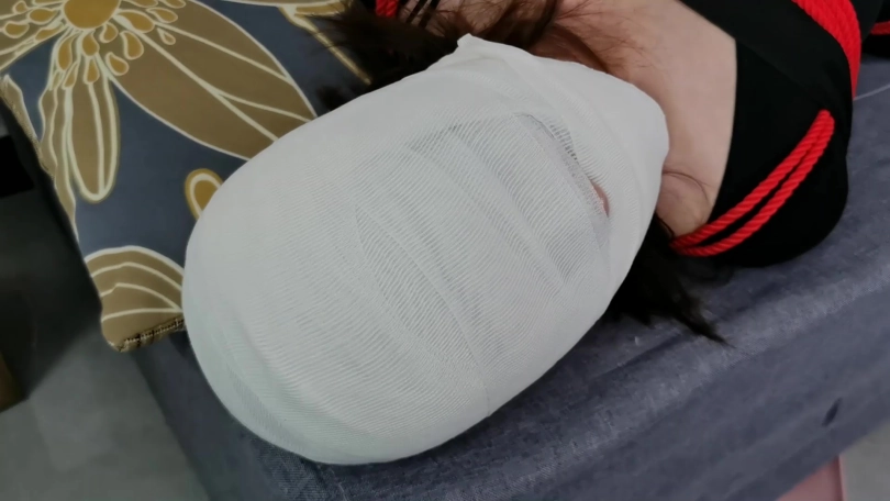 文文尝试把口中的丝袜吐出,但随之而来,银色的胶带贴满了她的整个面部与下巴。这还没有停下来,一整卷的白色绷带更把文文的面部包起来,她连最后求救的方法也失去了。
