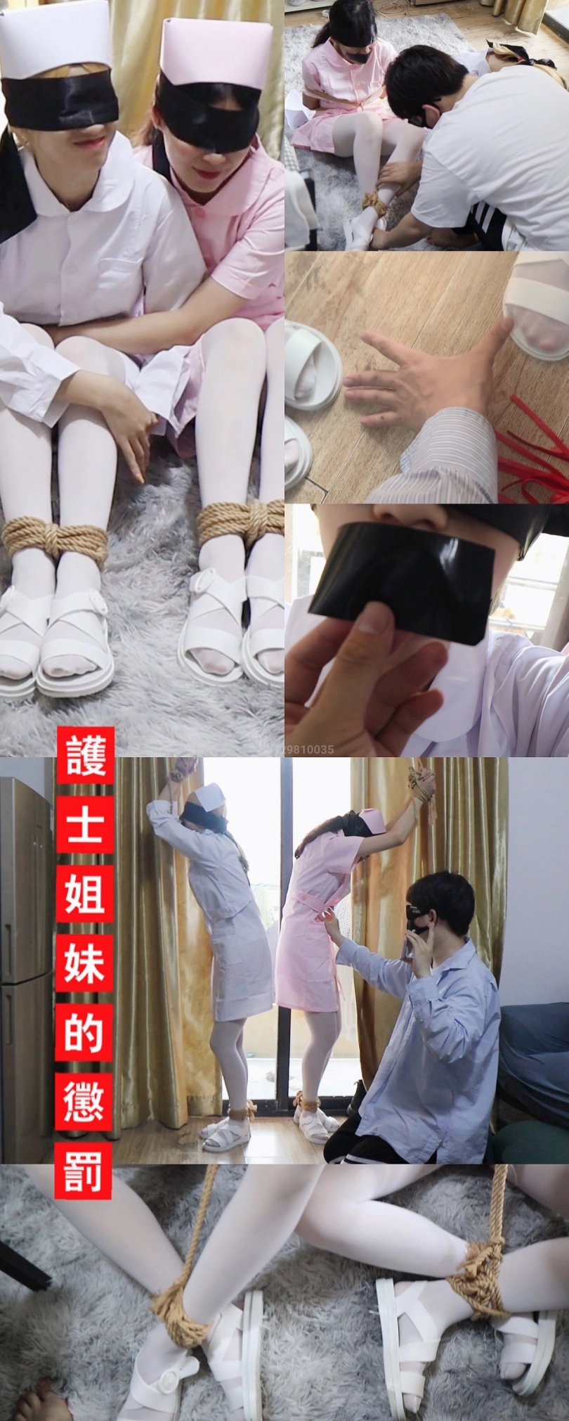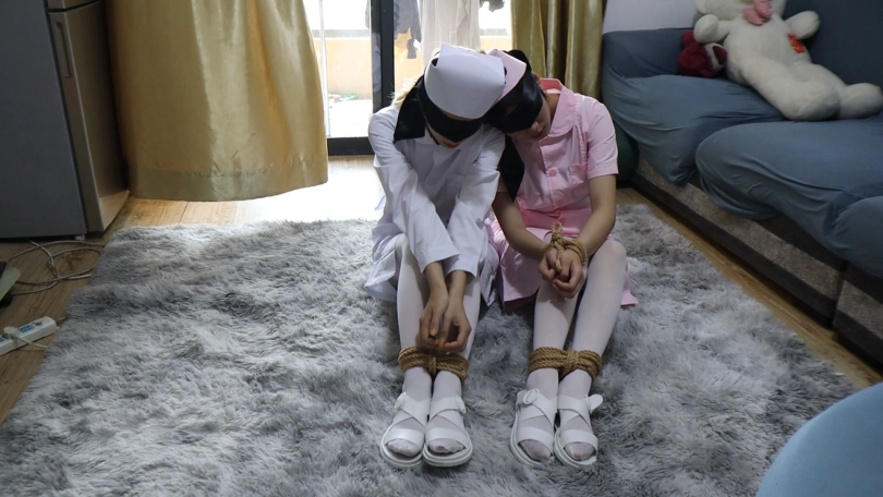 白衣+粉衣护士的惩罚游戏 绑起手脚来之后就把两个护士姐妹的双手吊在房梁上,封住两个小护士bb的嘴巴,那么游戏开始啦,手慢慢地摸在少女的身体上,摸到谁谁就本能的呜呜叫的往后退,但是的确无处可退啦,手脚都被绑着,只能任人欺负 躲的慢的就要被鞭子打!到后面为了躲挨打,这一对姐妹使出了浑身解术跑,肯定是跑不了的啦,抽到的就只能哭喊挣扎了,到最后都躲到窗帘后面啦,第二幕直接盘腿缚上,穿着护士鞋的白丝玩弄,两个护士姐妹一起玩弄欺负,为了不被欺负只能委屈的乱动挣扎,可是被绑的死死的,想跑也跑不了