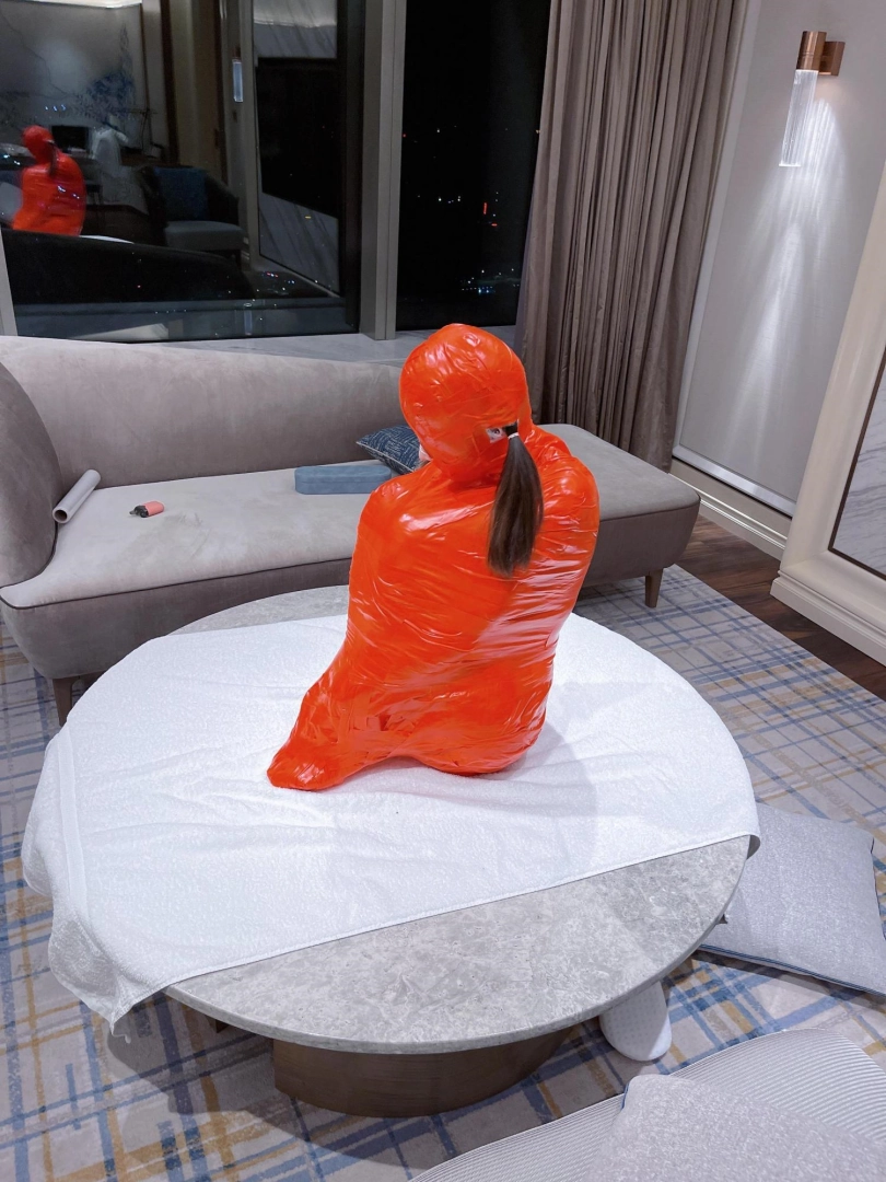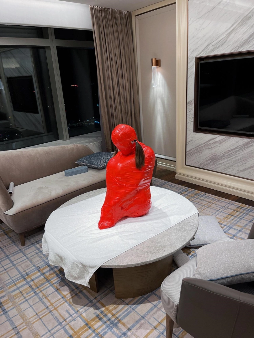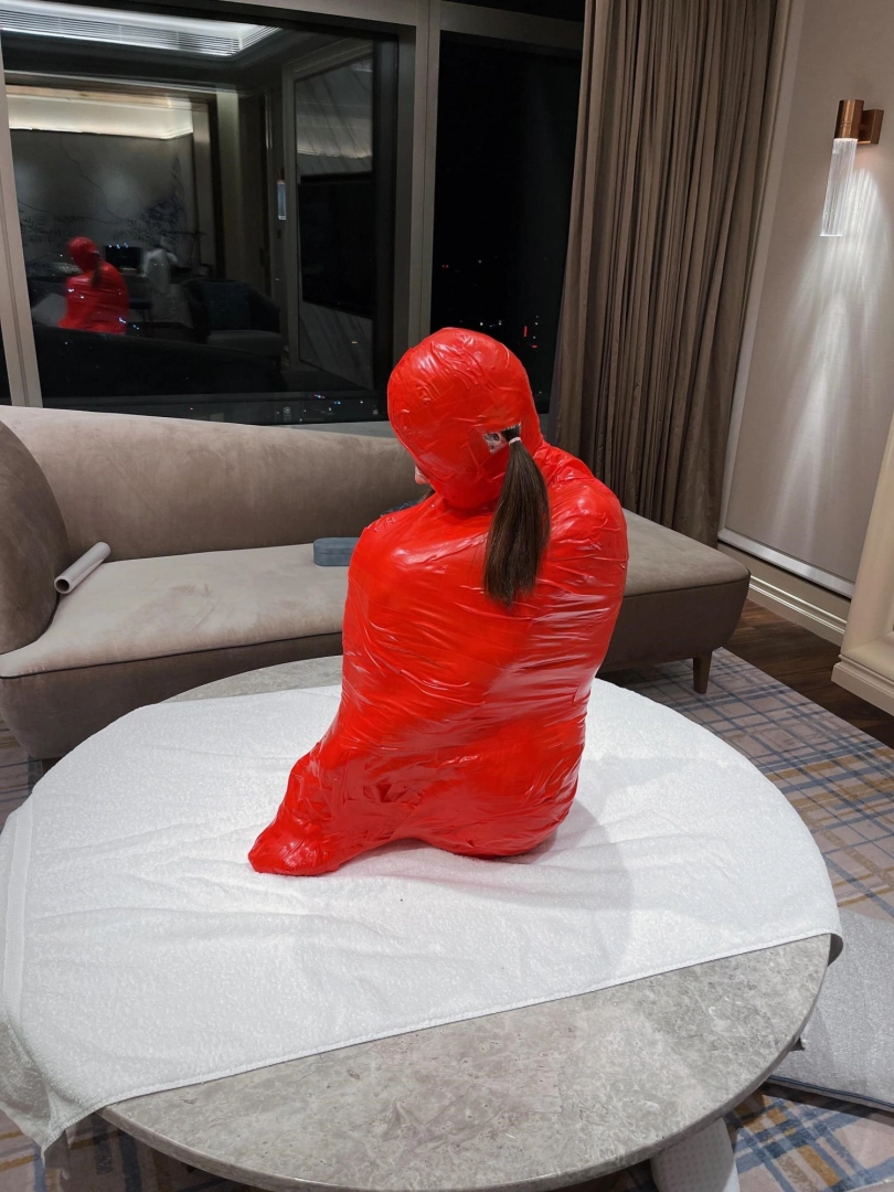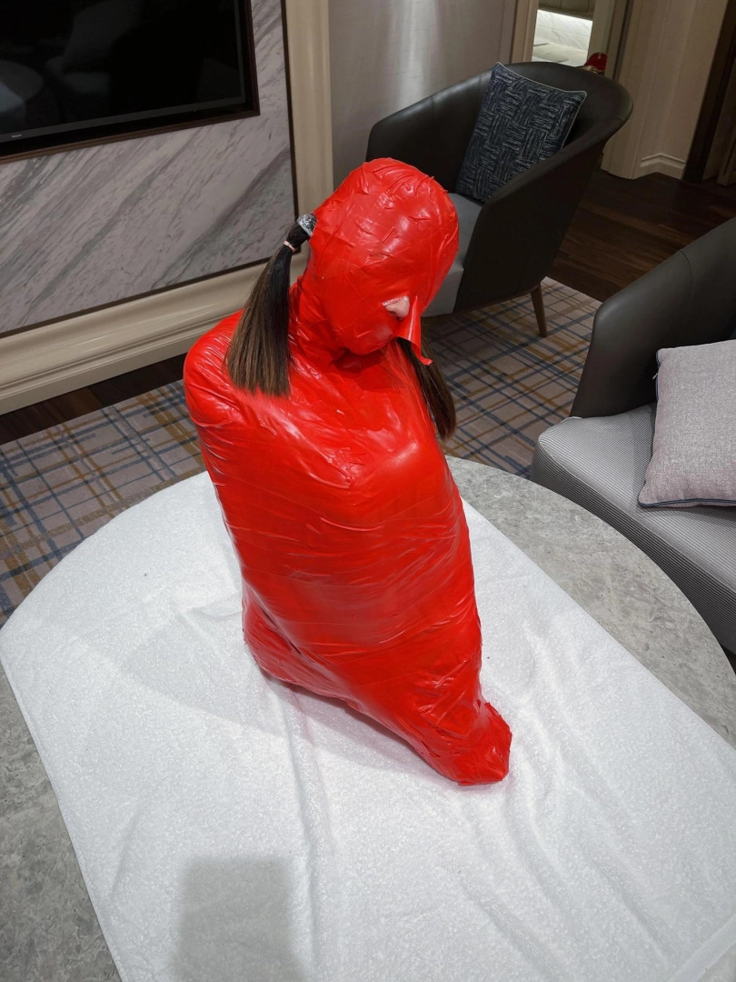 对方先是在茶茶的身体里塞入了玩具,随后茶茶娇小的身体被要求蜷缩起来,随后便被用一层保鲜膜和两层胶带仔细地全包贴好,随即就被摆放在客厅的大理石茶几上,作为一个人体摆件被放置着。