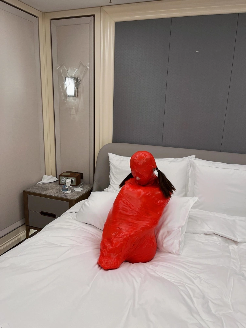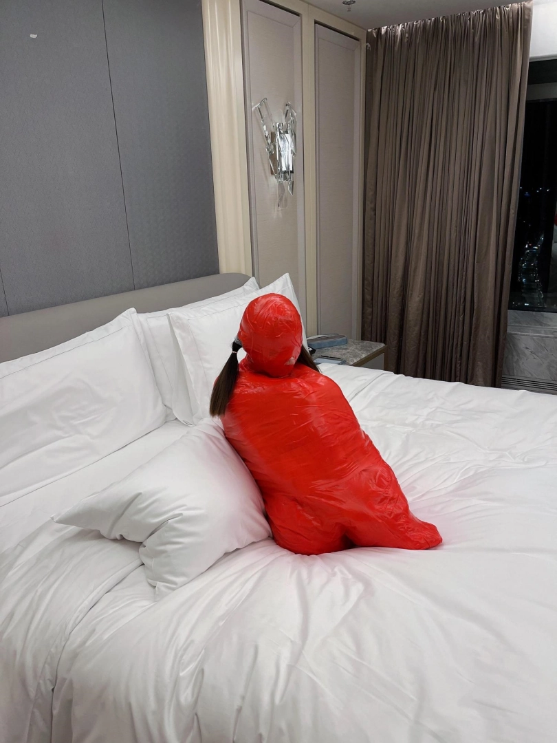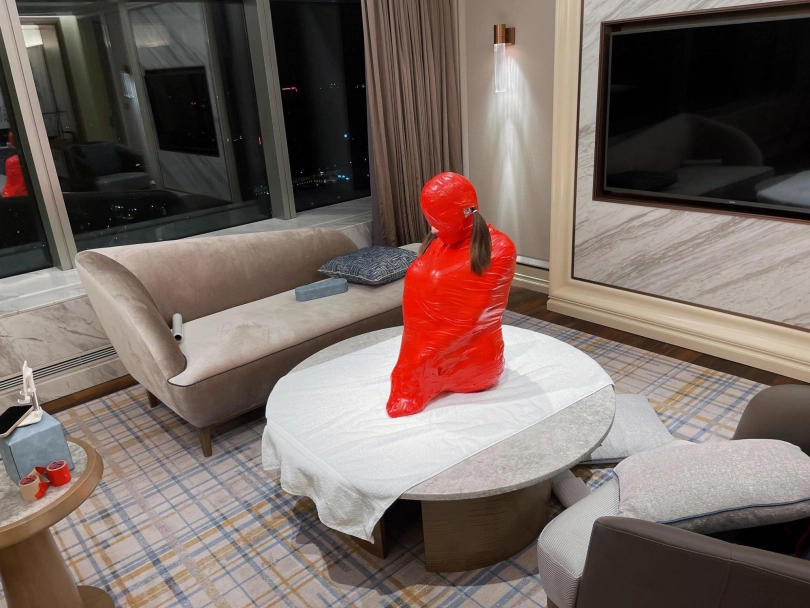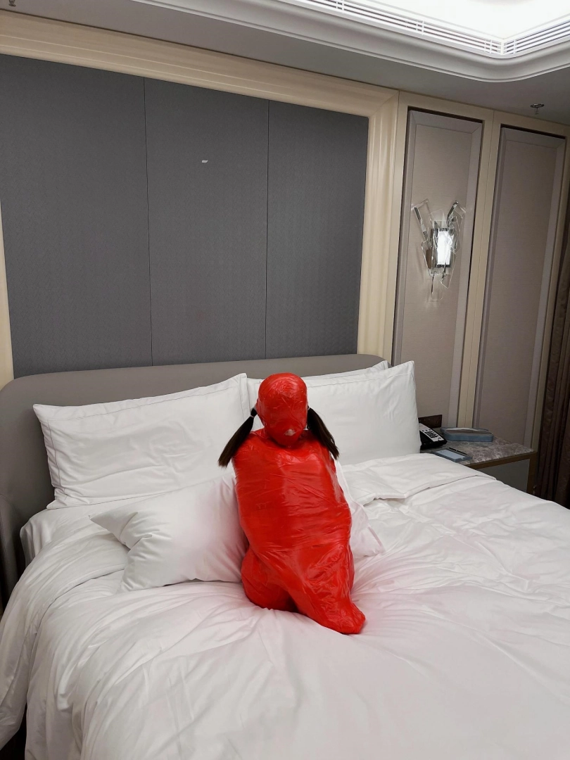 对方先是在茶茶的身体里塞入了玩具,随后茶茶娇小的身体被要求蜷缩起来,随后便被用一层保鲜膜和两层胶带仔细地全包贴好,随即就被摆放在客厅的大理石茶几上,作为一个人体摆件被放置着。