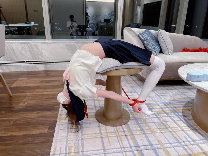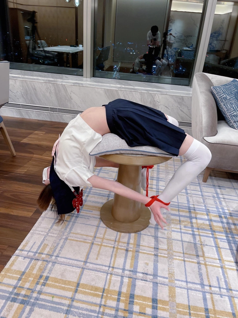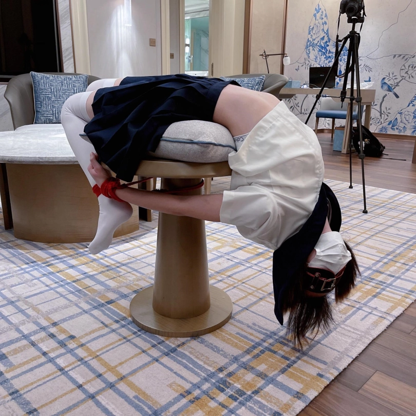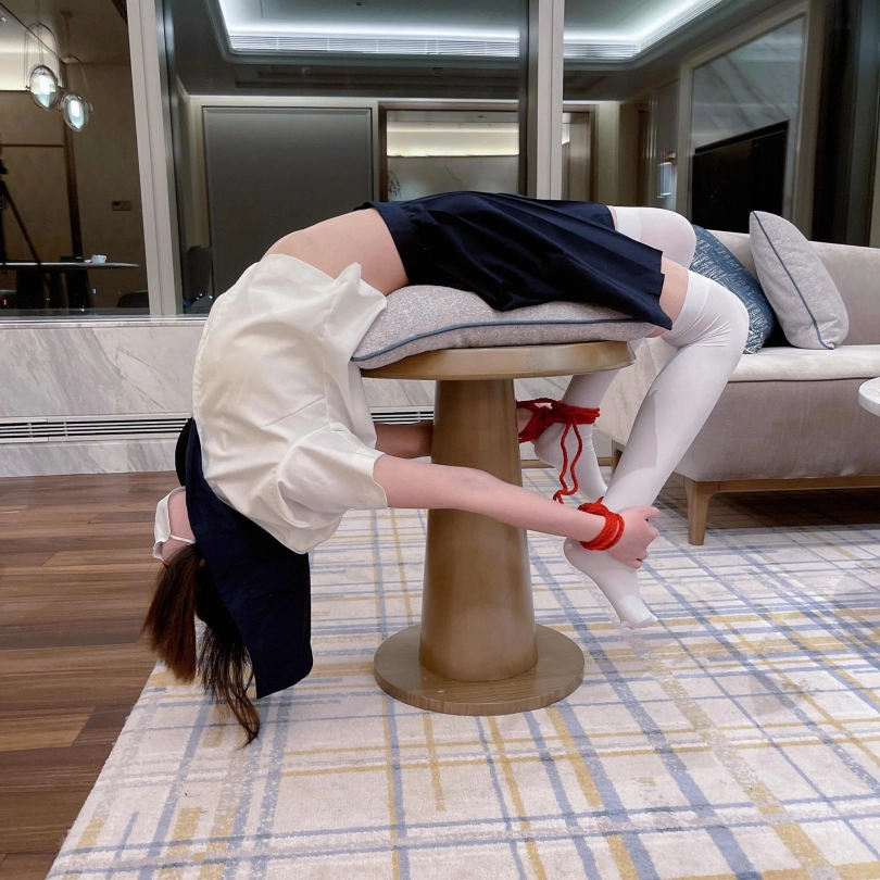 把白丝jk双马尾的茶茶邀请到家中,用大理石材质的小桌子支撑茶茶的腰,手腕脚腕绑在一起,强迫茶茶大头朝下摆出瑜伽的姿势。
