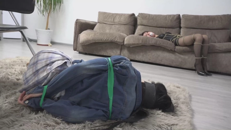 再醒过来,发现妹妹被绳子绑在了椅子上,嘴里被勒着丝袜,而姐姐则被绿色胶带用驷马的方式绑在了地上,鼻子正好对着妹妹的没有穿鞋的脚,闻着臭脚,嘴里同样被嘞着丝袜,被限制说话,两人的眼睛也都被蒙着。