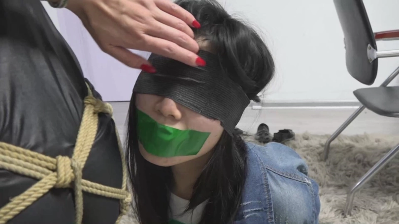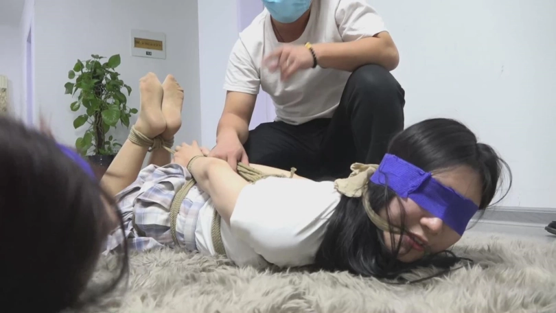 姐姐先是让妹妹低头,用被绑在背后的手把妹妹的眼睛和嘴巴的胶带撕了下来,并且把嘴里的东西扯掉,获得呼吸的妹妹喘了口气,开始解起胶带。小声说着:我们往门口走!
