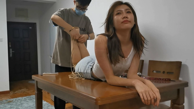 高颜值的新疆维族美女粒粒(雪娜),身上有一种别样的异域风情,1米7的身高柔韧性也非常好,可以完成很多极限的捆绑。这次也专门为她设计了极限后手观音紧缚放置的挑战,然后再老规矩模特独自放置挣扎寻找逃脱可能。后手观音可以说是紧缚里最严厉的束缚了,不管柔韧性多么好的模特被绑成了这个姿势无论怎么挣扎都是无效的。不过妹子嘴巴太小,用稍微大一点的口球都带不进去,用小号的口球也塞得满满的。