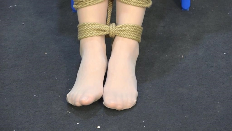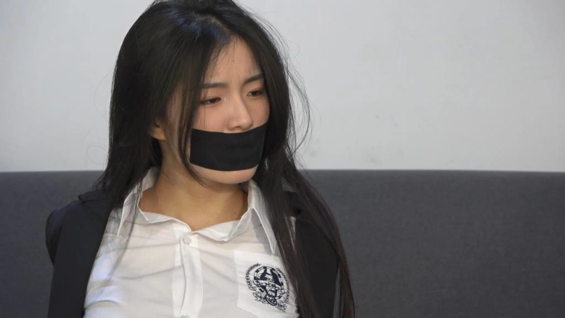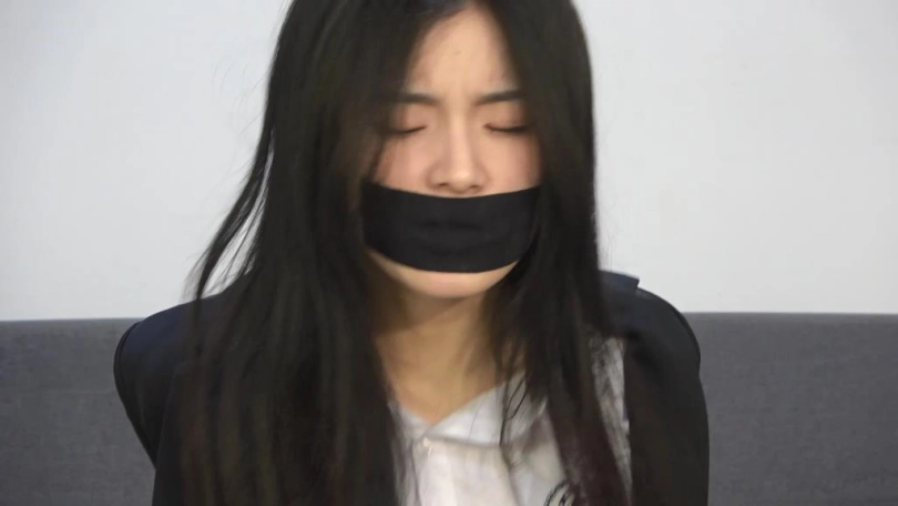 嘴巴用丝袜堵嘴,然后在外面用黑色胶带封住嘴巴(如果模特嘴巴小,请用薄丝袜或者单支的丝袜,不要让大片丝袜露出嘴巴)